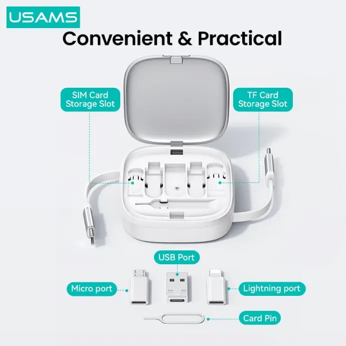Bộ cáp Sạc Dây Rút Đa Năng USAMS 60W (Tích Hợp Bộ Đầu chuyển, micro port, USD, lightning, card pin)