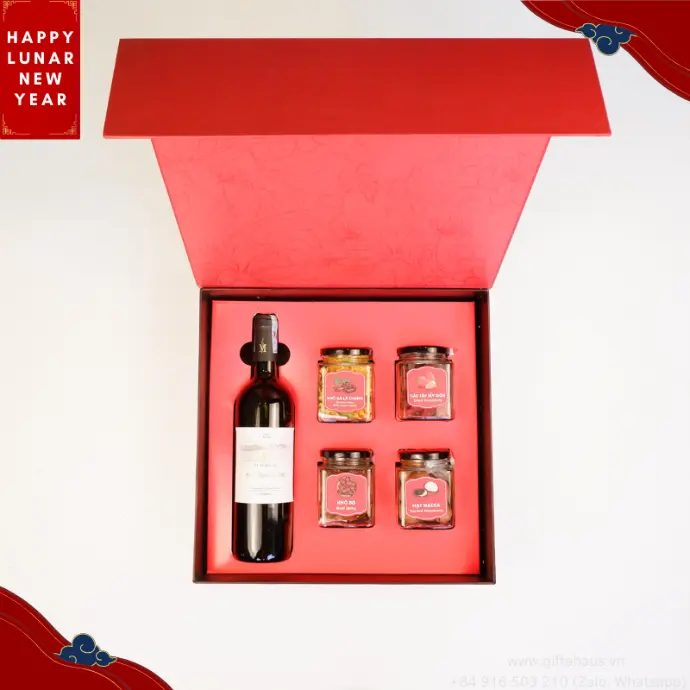 Hộp quà Tết Thịnh Vượng 4 hủ thủy tinh và rượu vang- Hộp quà tết doanh nghiệp 2024