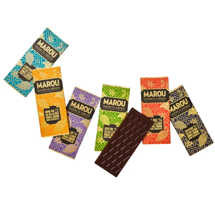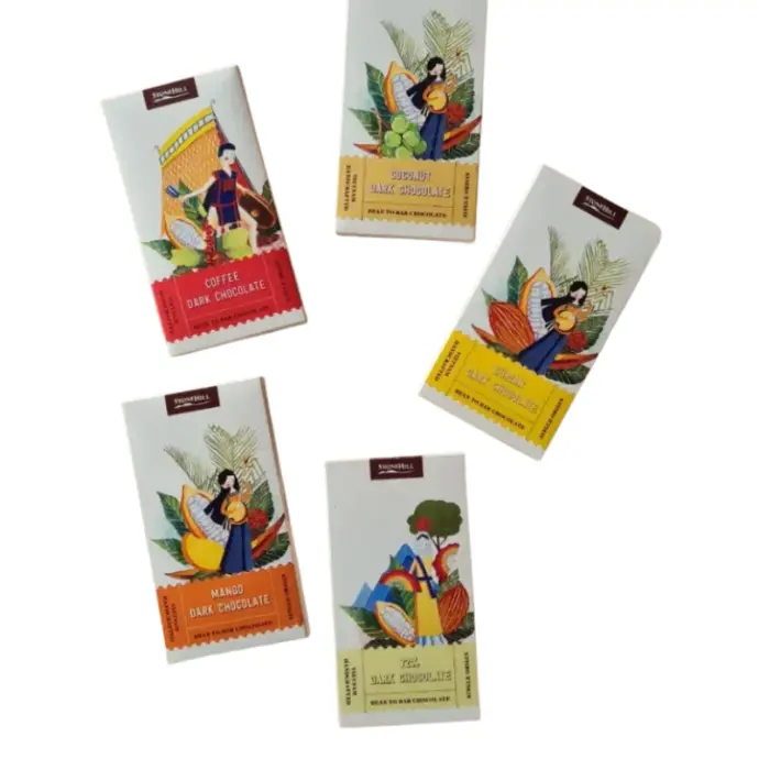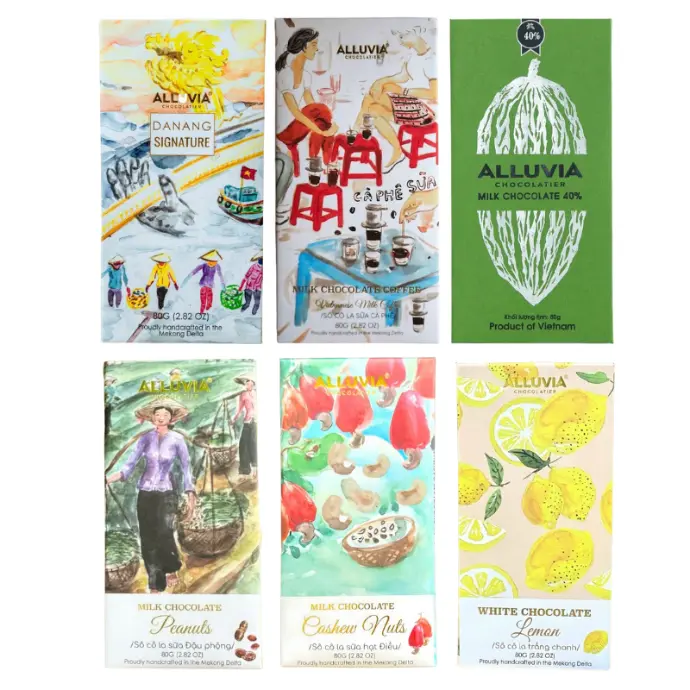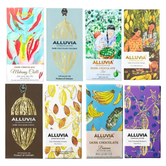 Dark chocolate (vị ớt, xoài, chuối, dừa, hạnh nhân, tiêu, quế) 80g Alluvia