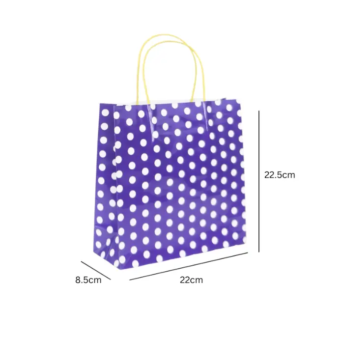 Túi xách giấy tím chấm bi trắng, quai vàng